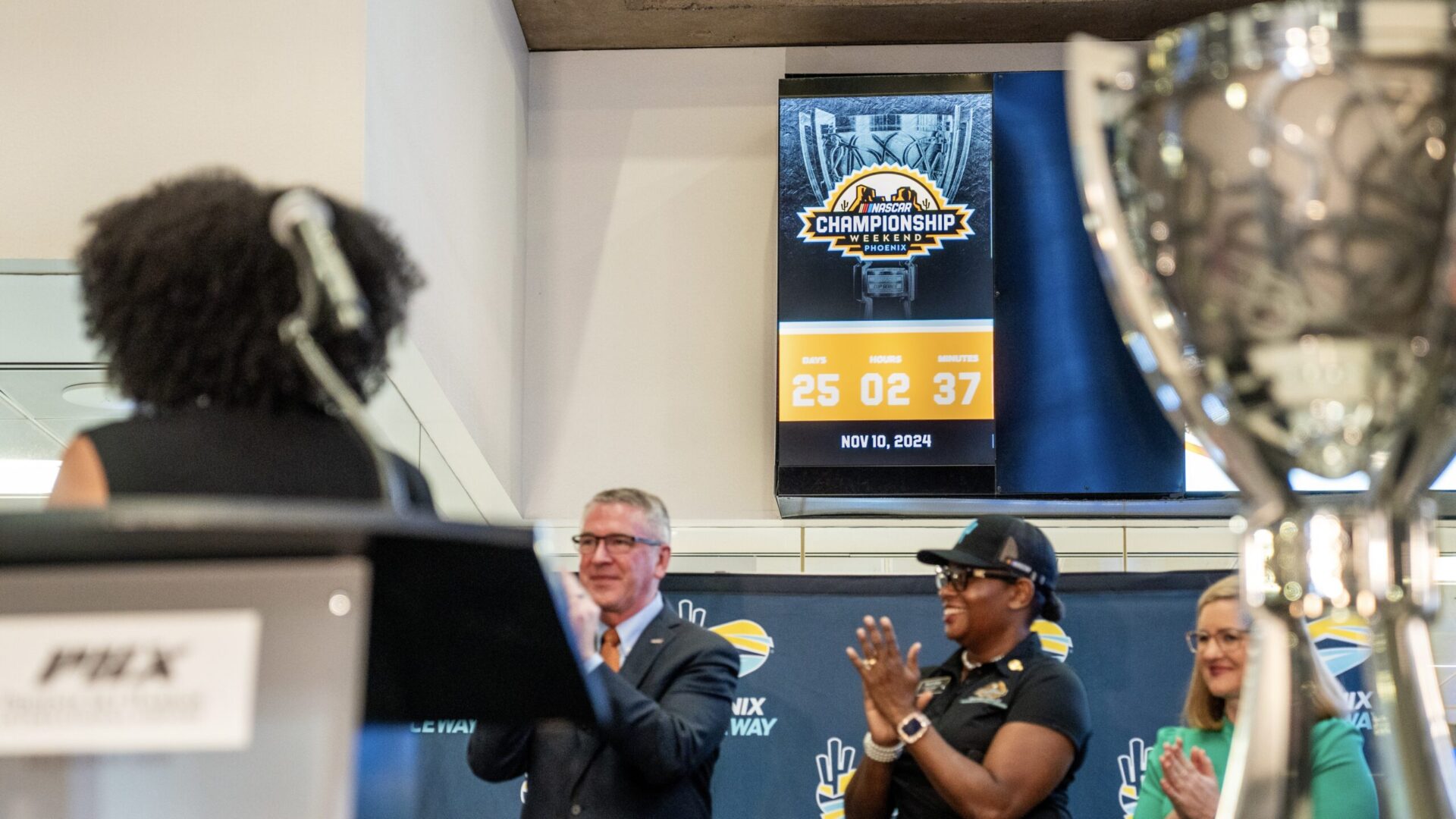 On Wednesday, Phoenix Raceway president Latasha Causey showed off the Official Countdown Clock for NASCAR Championship Weekend at Sky Harbor’s Terminal 4. Local leaders like Phoenix Mayor Kate Gallego, City of Avondale Councilmember Max White, Arizona Office of Tourism Public Information Officer Josh Coddington and others were all in attendance.