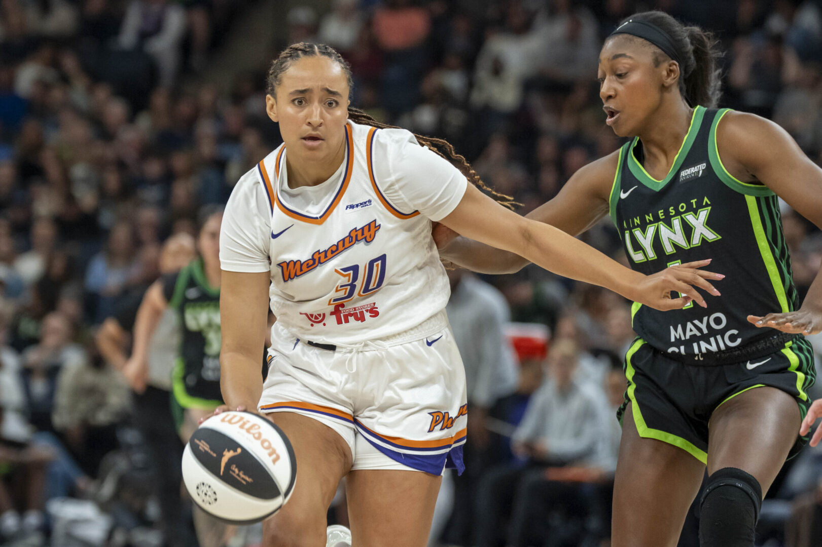 Jun 7, 2025; Phoenix, Arizona, USA; Phoenix Mercury guard Haley Jones (30) drives on Seattle Storm guard Zia Cooke (7) in the second half at Footprint Center. Mandatory Credit: Rick Scuteri-Imagn Images