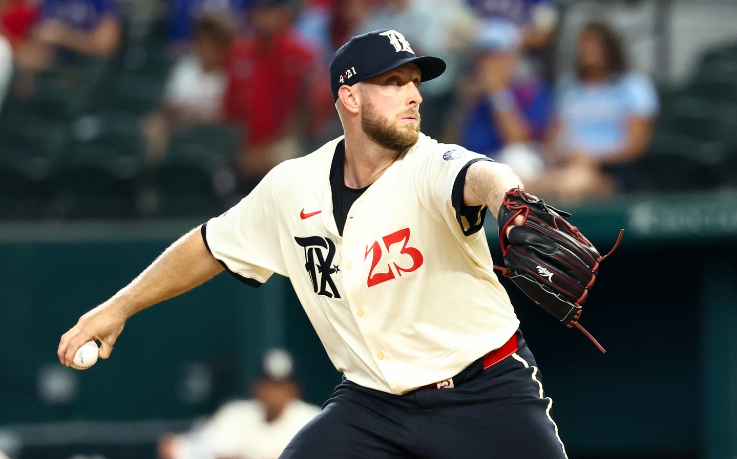 Aug 24, 2025; Arlington, Texas, USA; Texas Rangers starting pitcher Merrill Kelly (23) comes off the field after he pitches against the Cleveland Guardians during the first inning at Globe Life Field. Mandatory Credit: Jerome Miron-Imagn Images