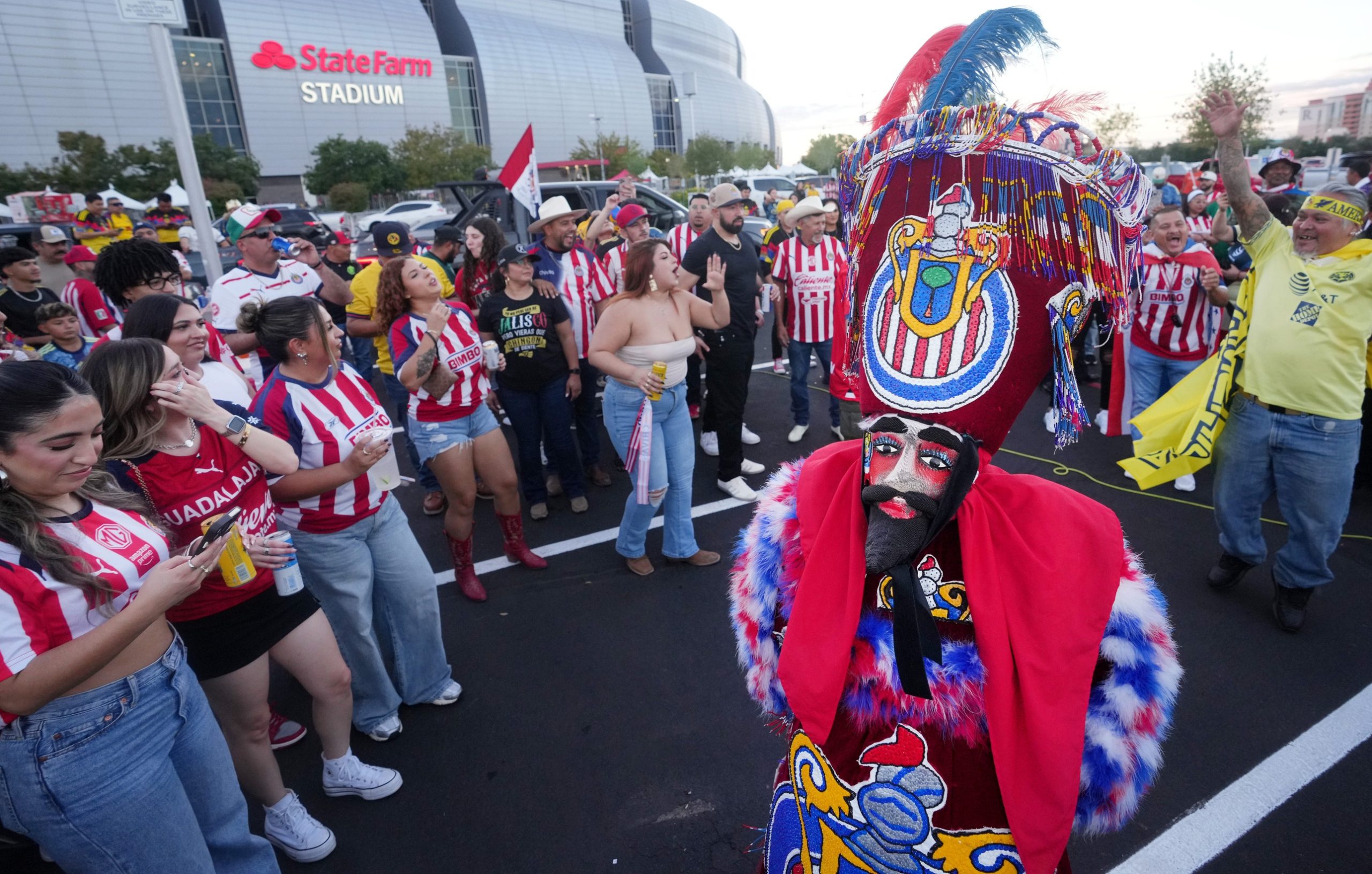 Danny Torres, from left, Victor Perez and Carlos Rodriguez gather outside State Farm Stadium in Glendale for the El Clásico de México soccer match between Club América and Chivas de Guadalajara on Saturday, Oct. 11, 2025, in Glendale. © Joe Rondone/The Republic / USA TODAY NETWORK via Imagn Images