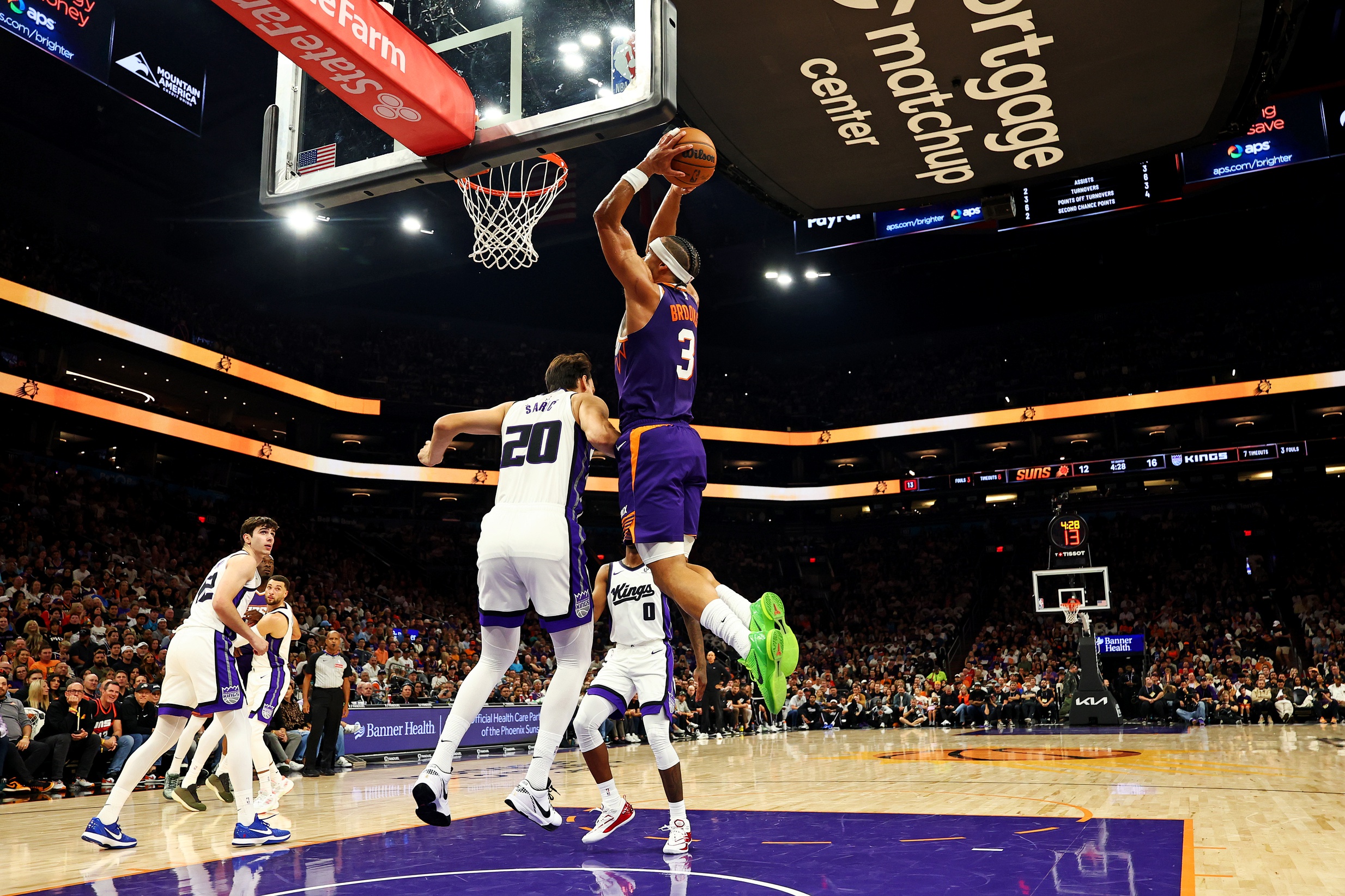 Oct 22, 2025; Phoenix, Arizona, USA; Phoenix Suns forward Dillon Brooks (3) reacts to a play during the second half against the Sacramento Kings at the Mortgage Matchup Center. Mandatory Credit: Mark J. Rebilas-Imagn Images