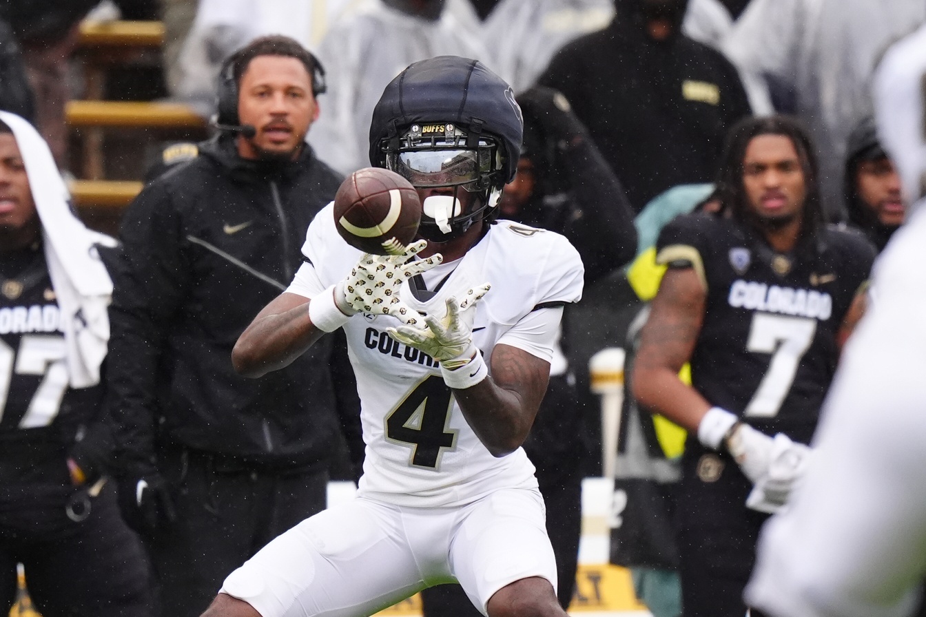 Oct 12, 2024; Boulder, Colorado, USA; Colorado Buffaloes wide receiver Omarion Miller (4) celebrates after a first down during the second half against the Kansas State Wildcats at Folsom Field. Mandatory Credit: Christopher Hanewinckel-Imagn Images